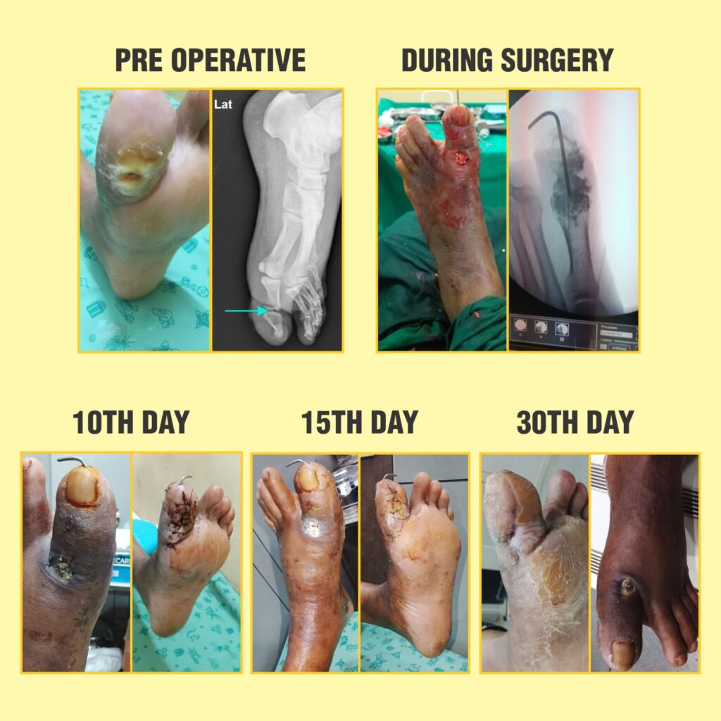 - சர்க்கரை முறையான கட்டுப்பாட்டில் இல்லாத நிலையில் காலில் புண் ஏற்பட்டு ஆறாமல் இருந்து வந்தது.